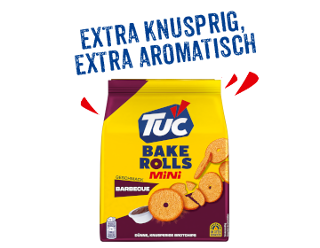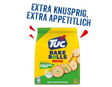 Bake Rolls stehen für eine einzigartige Kombination aus fein geschnittenem, doppelt gebackenem Brot und verschiedenen Gewürzen. Mit ihrem intensiv-köstlichen Geschmack und ihrer extra knusprigen Textur kann man ihnen einfach nicht widerstehen! TUC Bake Rolls gibt es in vielen verschiedenen, immer unwiderstehlichen Sorten. Der perfekte Knabber-Snack zum Teilen oder Selbergenießen.